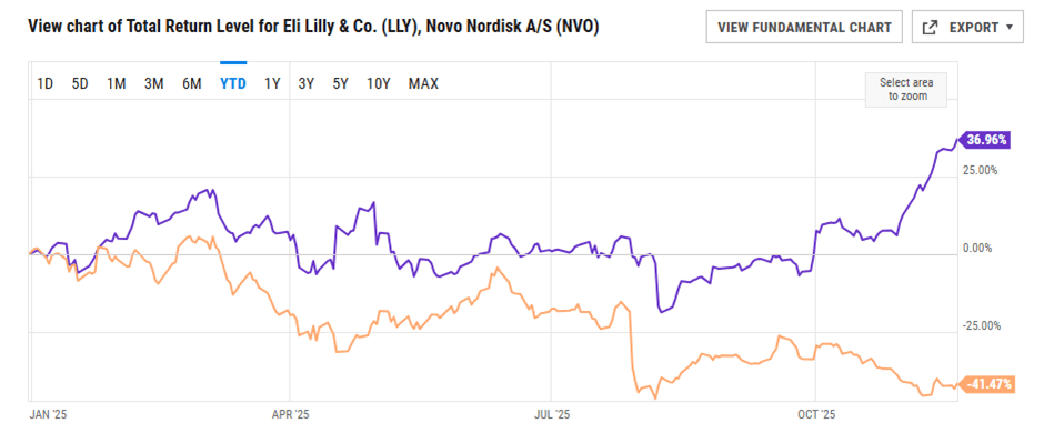 4. Lilly Winning Weight Loss War vs. Novo Nordisk….Stocks LLY +36% vs. NVO -41% 2025