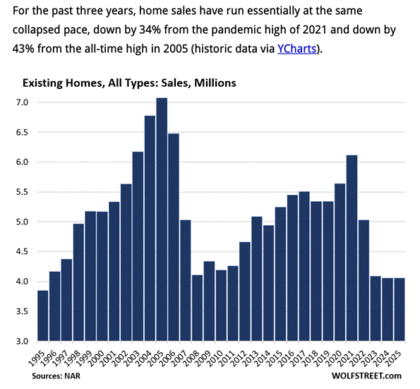 Sales of Existing Homes in 2025 Drop to Lowest since 1995, Sellers Massively Yank Listings off the Market, Waiting for Spring-by Wolf Richter