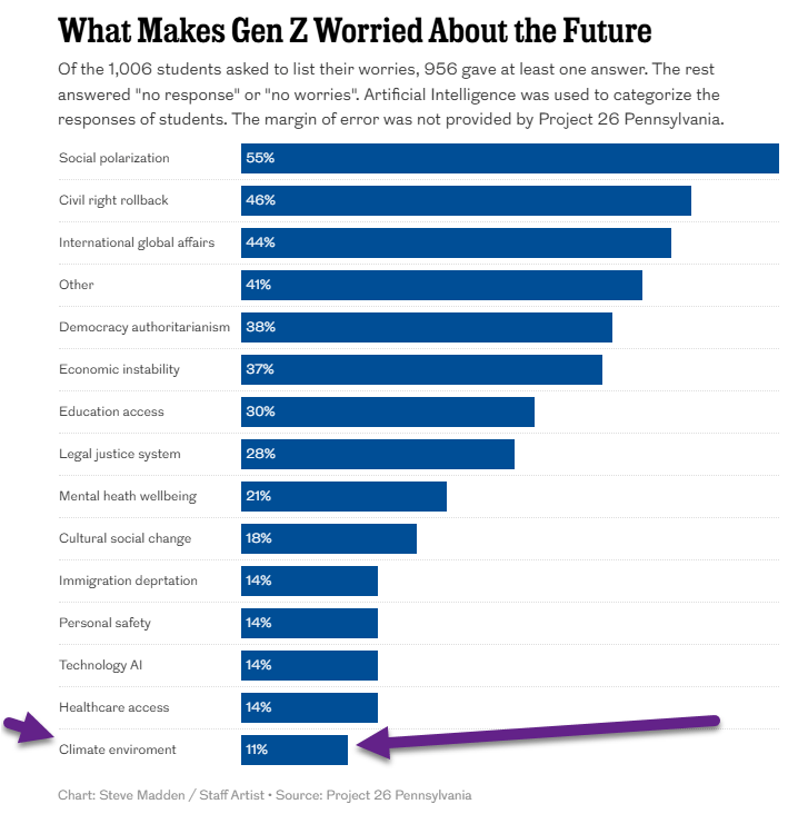 10. Interesting Poll of Pennsylvania College Kids….2% Trust Politicians, Climate/Environment Ranks Last in List of Worries, and Academics Come In Last for Information Sources