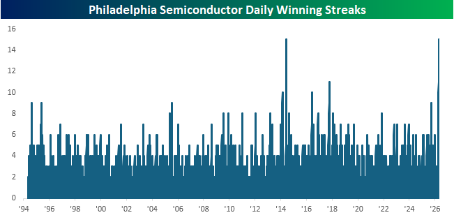 Semiconductors continued to roll yesterday as the Philadelphia Semiconductor Index (SOX) traded higher for the 15th straight day, tying the record from June 2014. Besides these two periods, there have only been three other periods where the SOX even had a ten-day winning streak.
