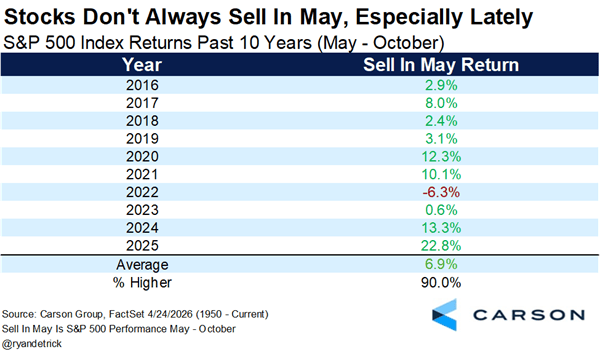 Seasonality. "Yes, the worst six months are coming up soon (May - October). But these six months have been lower only once the past decade and last year was the greatest Sell in May return ever (+22.8%). We are expecting another strong return this year."