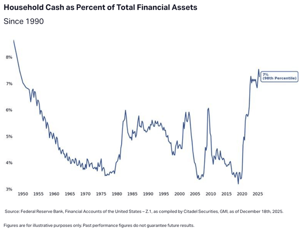 Household cash. "Households continue to hold near-record cash balances (98th percentile historically), leaving substantial dry powder should confidence and risk appetite continue to improve. We see this 'buy-the-dip' behavior, every day in our data at Citadel Securities."