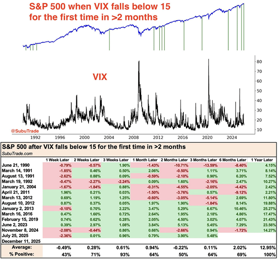 VIX. "$VIX has dropped below 15 for the first time in over 2 months, signaling a return to more normal volatility. Past cases saw $SPX higher 13 out of 14 times after 3 weeks & higher every time 1 year later."