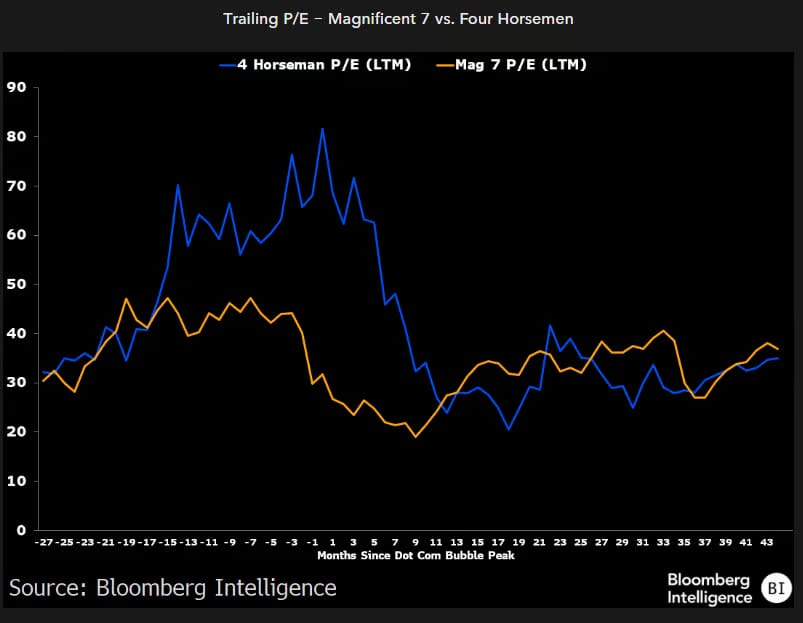 Mag 7 vs. Four Horseman. "The P/E ratios of the Mag 7 today are elevated nowhere near the Four Horseman of the '90s (Cisco, Msft, Dell, Intel). Mag 7 is trading at 36.8x earnings, below the 47.3x in 2021 and well below the 80!) of the Four Horseman pre-dot com crash."