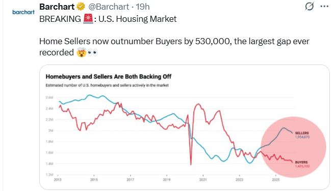 Highs vs. lows. “This is a very split market. 16% of S&P 500 stocks are at 52 week highs while 5% are at 52 week lows. This only happened 3 other times: July 1990, August 2015, March 2025. Each were followed by at least a -10% $SPX correction in the next 2 months”