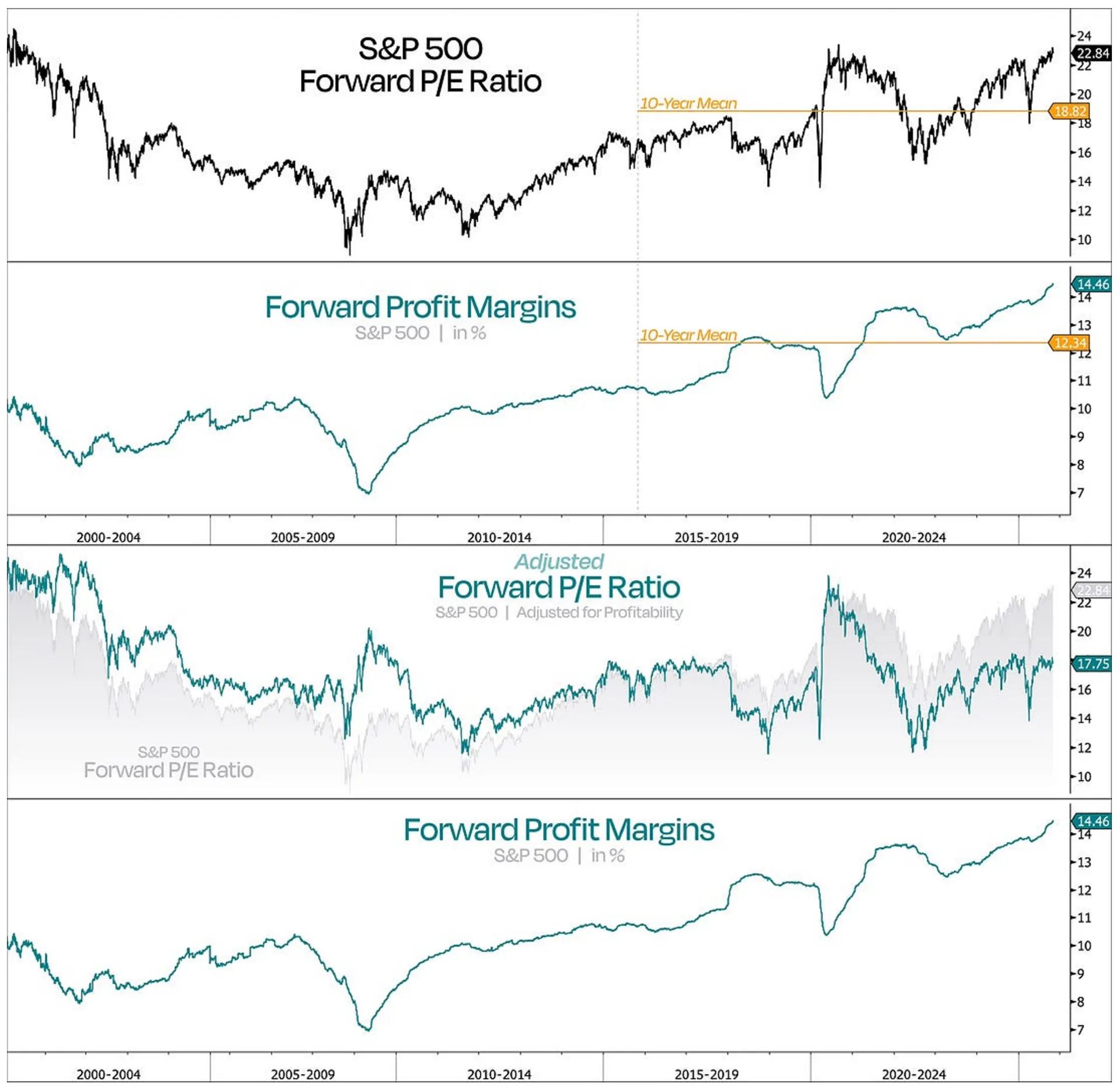 Profitability-adjusted valuation. "Anyone comparing today’s valuations to the Dotcom era on a basic P/E basis is missing the point ... higher profitability demands a higher valuation premium. Using our profitability-adjusted model, today’s P/E comes out to 17.75x — less than one standard deviation above its 20-year average of 16.2x."